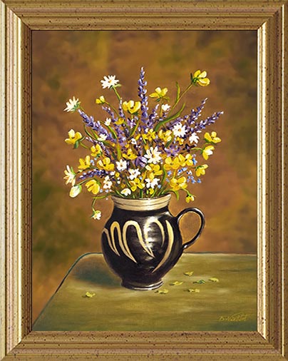Relevante Schlagwörter zum Gemälde: Feldblumengemälde, Blumenstrauß gemalt Gemälde, Blumen in Vase, Bild, Bilder, Stilllebenbilder, Stilllebengemälde