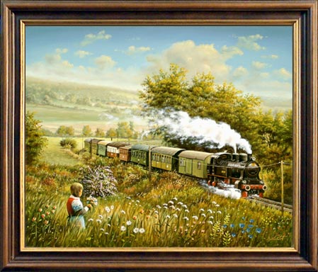 Gemälde zu der Ausstellung mit den Themen: Mattenberg, Blumenmädchen, Eisenbahn, Bahnhof, Eisenbahnaera, Eisenbahnära, Eisenbahnzeit, Lok, 206, Hessencourrier, Museumsbahn, Museums-Eisenbahn, Lokomotive, Dampflok, Zug, Züge, Eisenbahnbild, Eisenbahnbilder, Eisenbahnölbild, Eisenbahnölbilder, Eisenbahngemälde, Bild, Bilder, Gemälde, Ölgemälde, Eisenbahner