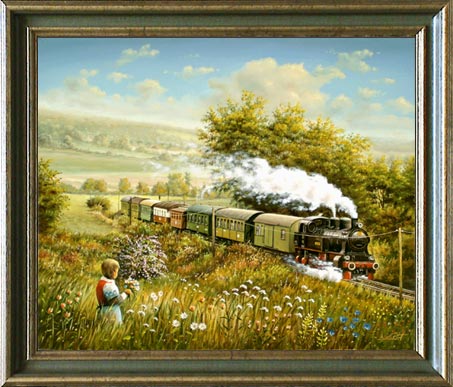 Gemälde zu Ausstellung mit den Themen: Mattenberg, Blumenmädchen, Eisenbahn, Bahnhof, Eisenbahnaera, Eisenbahnära, Eisenbahnzeit, Lok, 206, Hessencourrier, Museumsbahn, Museums-Eisenbahn, Lokomotive, Dampflok, Zug, Züge, Eisenbahnbild, Eisenbahnbilder, Eisenbahnölbild, Eisenbahnölbilder, Eisenbahngemälde, Bild, Bilder, Gemälde, Ölgemälde, Eisenbahner