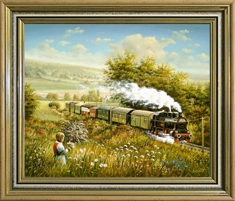 Gemälde zu der Ausstellung mit den Themen: Mattenberg, Blumenmädchen, Eisenbahn, Bahnhof, Eisenbahnaera, Eisenbahnära, Eisenbahnzeit, Lok, 206, Hessencourrier, Museumsbahn, Museums-Eisenbahn, Lokomotive, Dampflok, Zug, Züge, Eisenbahnbild, Eisenbahnbilder, Eisenbahnölbild, Eisenbahnölbilder, Eisenbahngemälde, Bild, Bilder, Gemälde, Ölgemälde, Eisenbahner