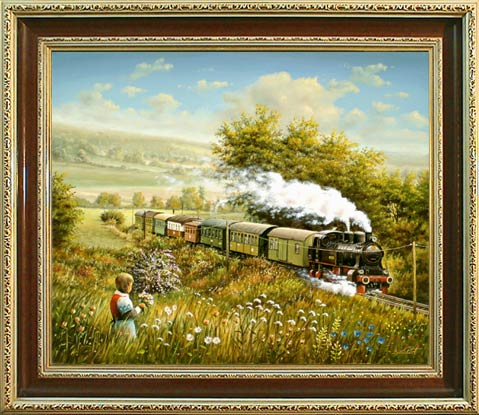 Gemälde zu der Ausstellung mit den Themen: Mattenberg, Blumenmädchen, Eisenbahn, Bahnhof, Eisenbahnaera, Eisenbahnära, Eisenbahnzeit, Lok, 206, Hessencourrier, Museumsbahn, Museums-Eisenbahn, Lokomotive, Dampflok, Zug, Züge, Eisenbahnbild, Eisenbahnbilder, Eisenbahnölbild, Eisenbahnölbilder, Eisenbahngemälde, Bild, Bilder, Gemälde, Ölgemälde, Eisenbahner