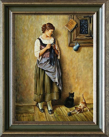 Katzenbild: Junge Frau beim Stricken mit Hauskatzen