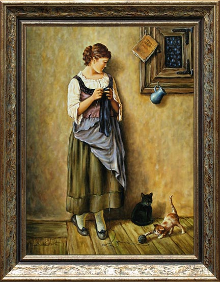Katzenbild: Junge Frau beim Stricken mit Hauskatzen