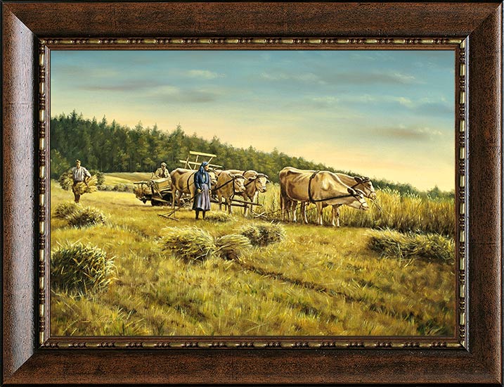 Ernte, Kornernte, Erntebild, gemalte Erntebilder, Erntegemälde, Erntegemaelde, Ernteölbild, Ernteoelbild, Ernteölbilder, Ernteoelbilder, Selbstbinder, Binder, Getreideernte, Kuh, Kühe, Kuehe, Bild, Bilder, Ölbild, Oelbild, Oelbilder, Ölbilder, Ölgemälde, Gemälde