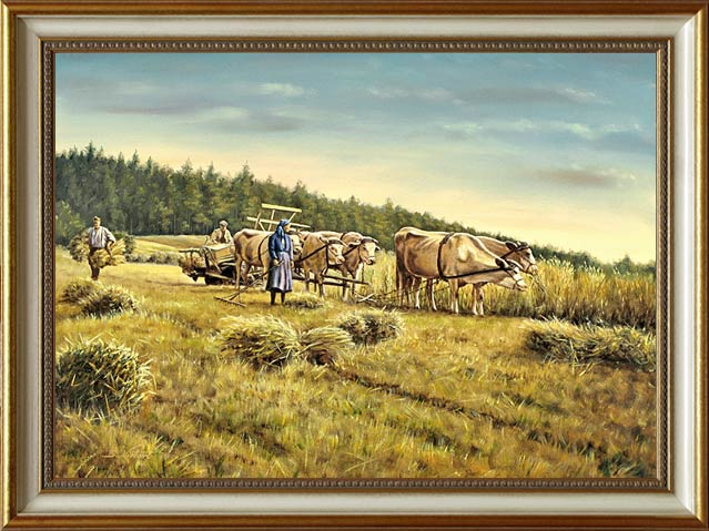 Ölbild/Erntebild mit Kuhgespann - Copyright by Kunstmaler / Heimatmaler B. Niebert