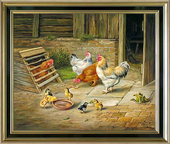 Relevante Suchbegriffe für das Gemälde Hühner auf dem Bauernhof: Hühner vor der Stalltür, Hühnergemälde, Küken mit Glucke im Verschlag, gemalte Hühnerbilder auf dem Hühnerhof, Huhngemälde, gemaltes Huhnbild vom Hühnermaler.