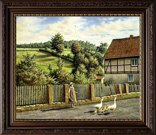 Dorfstrasse, Dorfleben, gemalte Gänsebilder Gänsehüten, Gansbild Gänselieschen, Hüten, Gänse Gans, Gänserich,