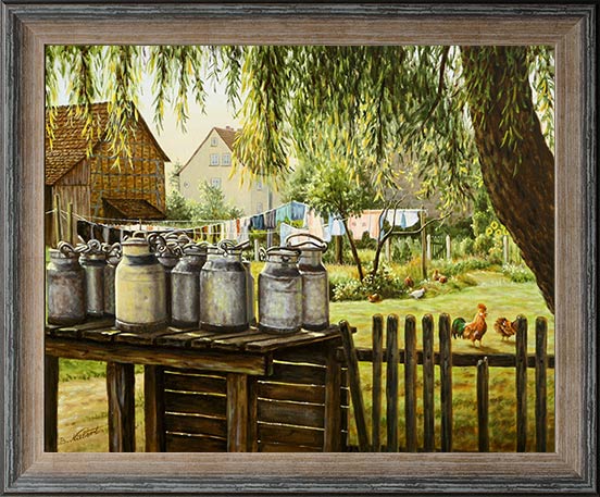 Relevante Schlagwörter zur Gemäldeausstellung Landleben: Milchkannen auf dem Dorf, Dorfstrasse, Dorfleben Milchbank, Kuhmilch, Milch, Milchabfuhr Gemälde, Bild, Bilder, Ölgemälde, Ölbilder, Ölbild.