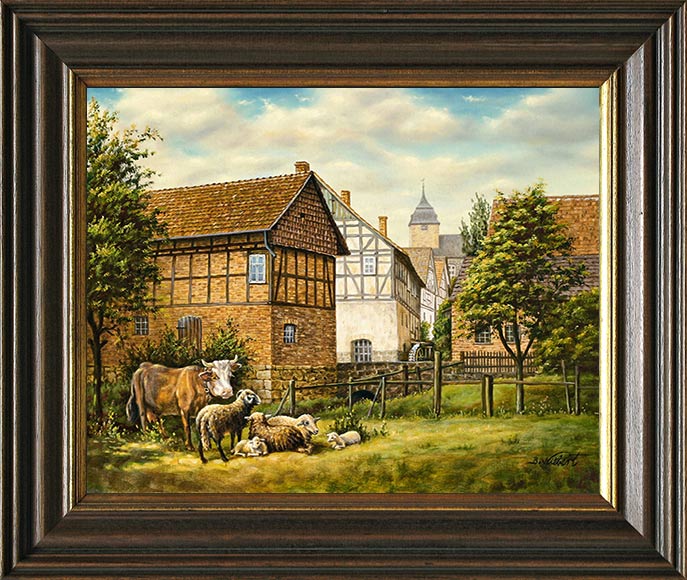 "Kuh mit Schafen an der Mühle am Dorfrand" mit Rahmen "500-60"