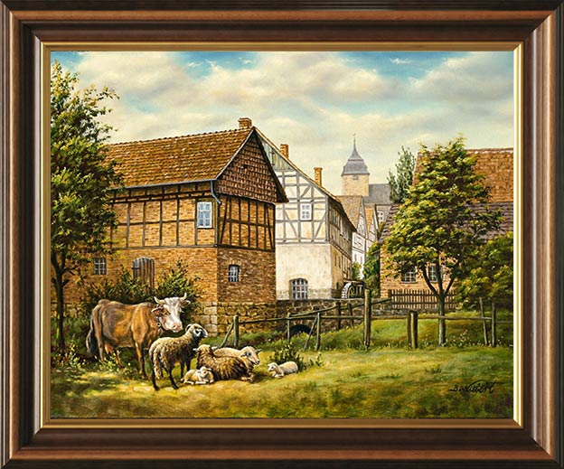 "Kuh mit Schafen an der Mühle am Dorfrand" mit Rahmen "Aachen schmal"