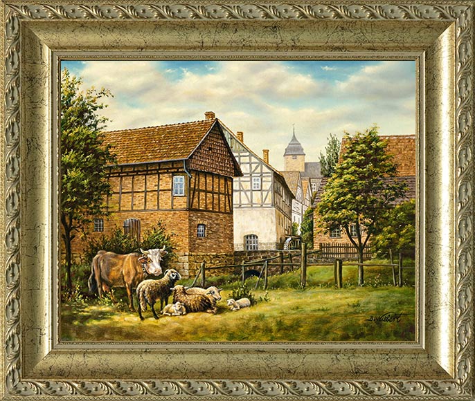 "Kuh mit Schafen an der Mühle am Dorfrand" mit Rahmen "Girland2 gold"