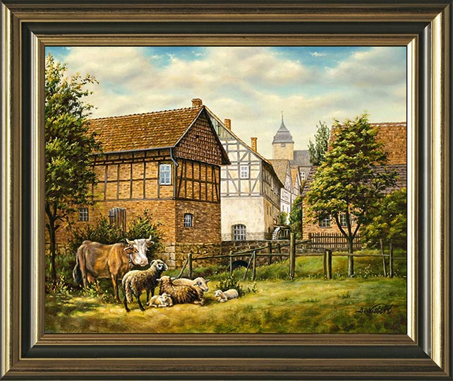 "Kuh mit Schafen an der Mühle am Dorfrand" mit Rahmen "R33"