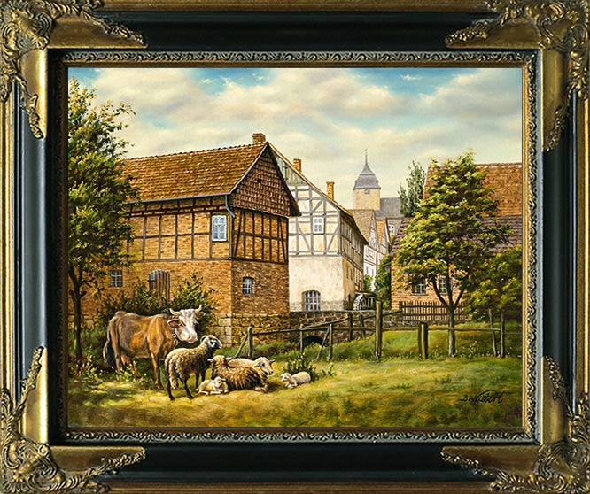 "Kuh mit Schafen an der Mühle am Dorfrand" mit Rahmen "Römer"