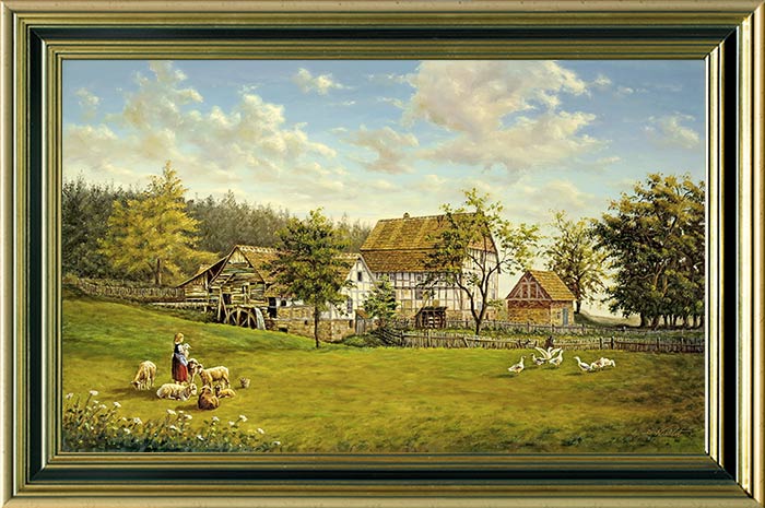 Relevante Schlagwörter zur Gemäldeausstellung Leben auf dem Lande / Landleben: Hütemädchen, Mühle, Mühlengemälde, Mühlenbild, Mühlenbilder, Mühlenölbild, Mühlenölbilder, Mühlrad, Mühlenrad, Wassermühle, Müller, Schaf, Schafe, Hüten, Gans, Gänse, Gänsewiese, Mühlbach, Bach, Gemälde, Bild, Bilder, Ölbild, Ölbilder