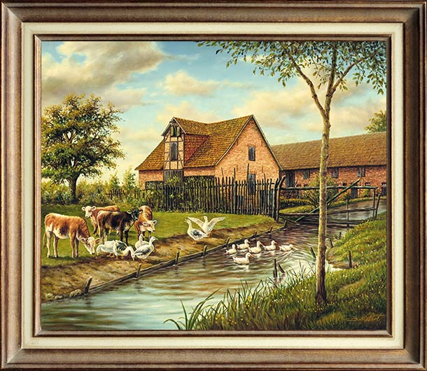 Relevante Schlagwörter zur Gemäldeausstellung Landleben, ländliche Motive: gemalte Rinder, Gänse, Enten am Mühlgraben hinter der Mühle, Wassermühle. Gemalte Bilder, Mühlenbilder  Zeichnungen Ölbilder, Ölgemälde. Gemälde in Öl, Vieh und Federvieh auf der Weide, alte Ansichten.