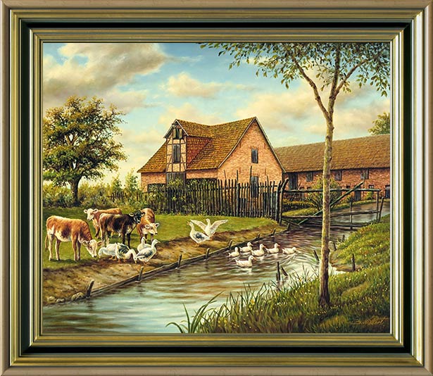 Relevante Schlagwörter zur Gemäldeausstellung Landleben: gemalte Rinder, Gänse, Enten am Mühlgraben hinter der Mühle, Wassermühle. Gemalte Bilder, Zeichnungen Ölbilder, Ölgemälde. Gemälde in Öl, Vieh und Federvieh auf der Weide.