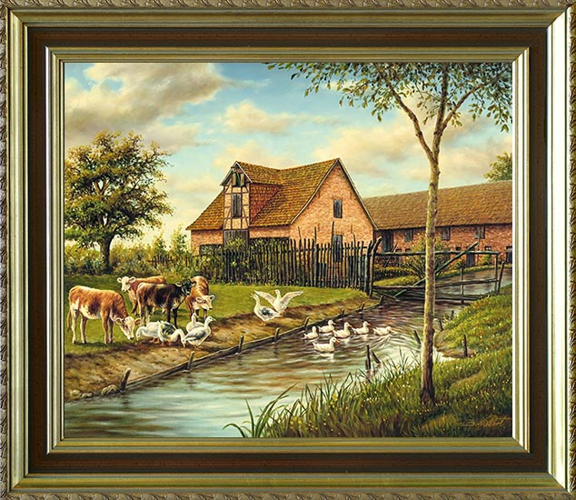 Relevante Schlagwörter zur Gemäldeausstellung Landleben, ländliche Motive: gemalte Rinder, Gänse, Enten am Mühlgraben hinter der Mühle, Wassermühle. Gemalte Bilder, Mühlenbilder  Zeichnungen Ölbilder, Ölgemälde. Gemälde in Öl, Vieh und Federvieh auf der Weide, alte Ansichten.