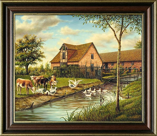Relevante Schlagwörter zur Gemäldeausstellung Landleben: gemalte Rinder, Gänse, Enten am Mühlgraben hinter der Mühle, Wassermühle. Zeichnungen Gemalte Bilder, Ölbilder, Ölgemälde. Gemälde Vieh und Federvieh auf der Weide.