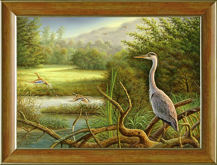 "Wenn die Natur erwacht" (Graureiher, abstreifende Stockenten und rüttelnde Falken)  Ölgemälde 50x70 cm