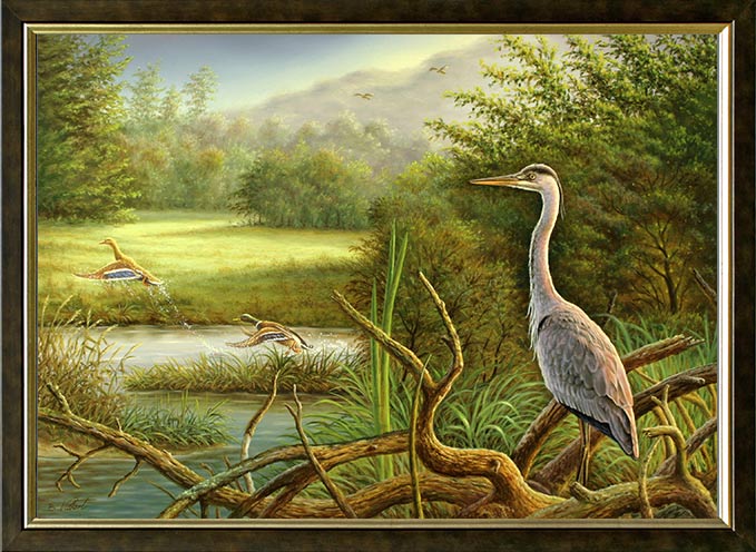 "Wenn die Natur erwacht" (Graureiher, abstreifende Stockenten und rüttelnde Falken)  Ölgemälde 50x70 cm