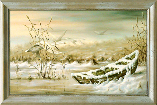 Ölbild / Verschneites Boot am See in Ostpreußen / Masuren“