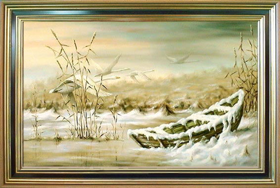 Ölgemälde / Landschaftsgemälde „Gemälde Schwäne in Masuren“