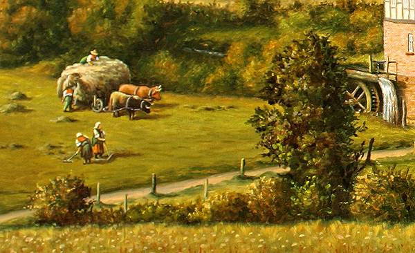 Heufuhrwerk mit Kühen / beim Heuladen - Copyright by Kunstmaler B. Niebert