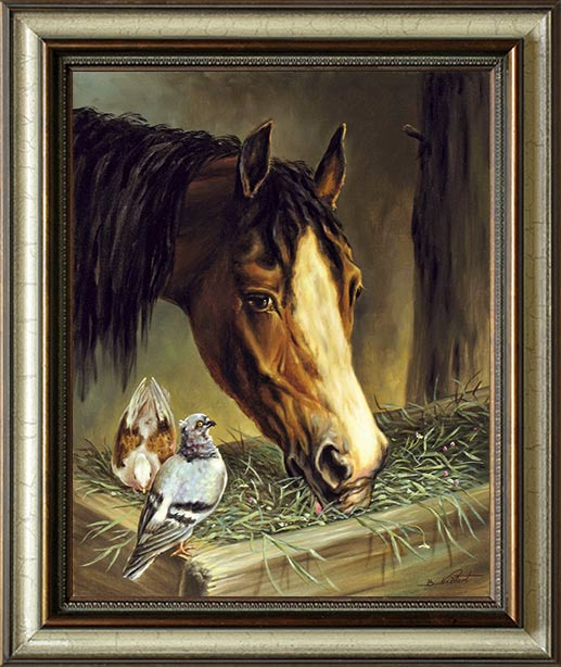 Relevante Suchbegriffe zum Pferdegemälde mit Tauben auf der Futtergrippe / Futtertrog: Gemalte Pferdebilder, Pferdezeichnung, Pferdetrog, Heutrog aus Holz, Futterraufe, Pferderaufe, gemalter Pferdekopf / Pferdeportrait im Pferdestall, Gemälde Bilder, gemaltes Pferdebild, Pferdegemälde