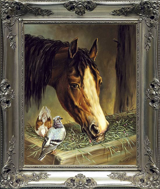 Relevante Suchbegriffe zum Pferdegemälde mit Tauben auf der Futtergrippe / Futtertrog: Gemalte Pferdebilder, Pferdezeichnung, Pferdetrog, Heutrog aus Holz, Futterraufe, Pferderaufe, gemalter Pferdekopf / Pferdeportrait im Pferdestall, Gemälde gemaltes Pferdebild, Pferdegemälde