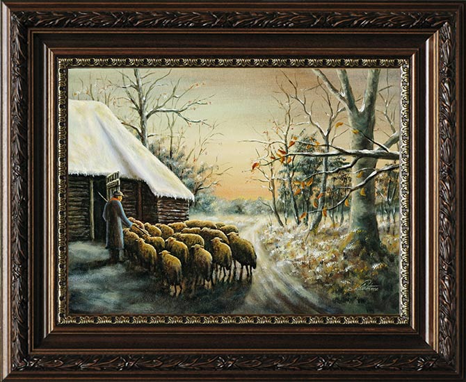 Schäferbilder: Schäfer mit Schafherde am Schafstall im Winter - Copyright by Kunstmaler / Heimatmaler B. Niebert