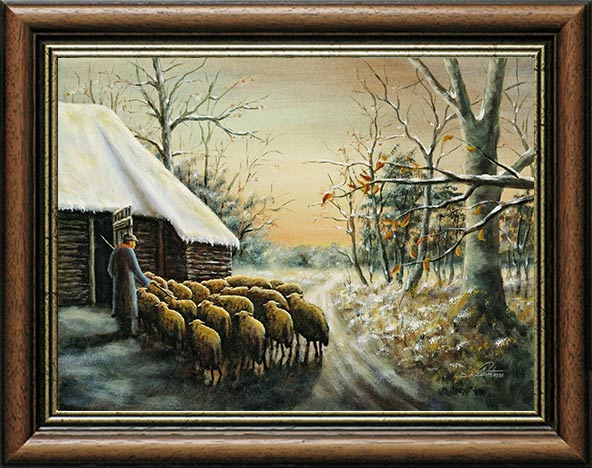 Schäferbilder: Schäfer mit Schafherde am Schafstall im Winter - Copyright by Kunstmaler / Heimatmaler B. Niebert