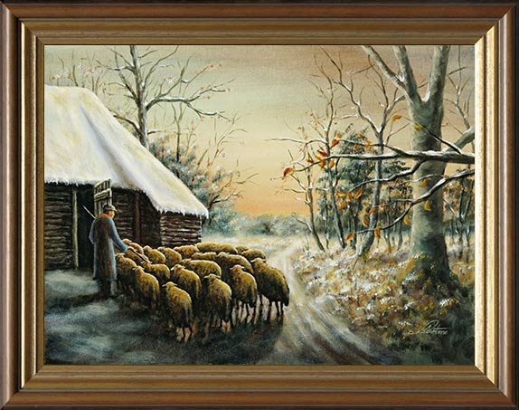 Schäferbilder: Schäfer mit Schafherde am Schafstall im Winter - Copyright by Kunstmaler / Heimatmaler B. Niebert