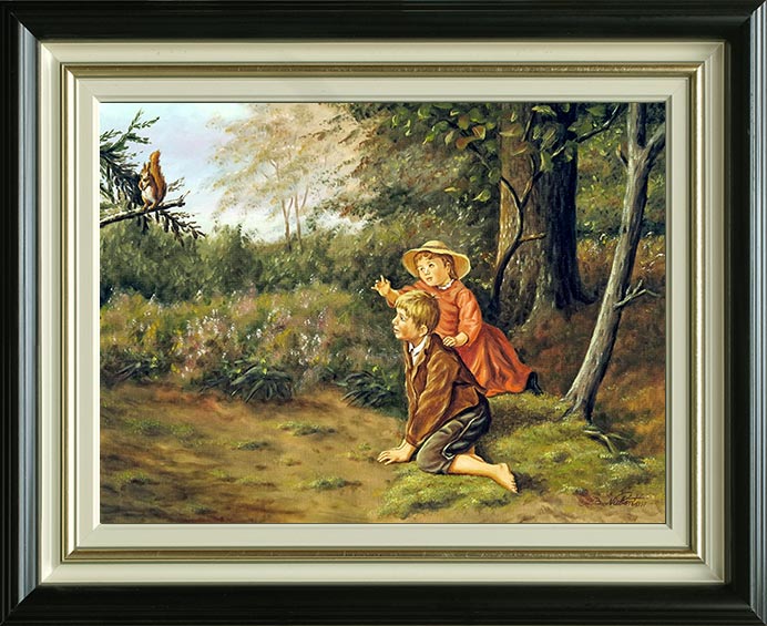Gemalte Tierbilder mit Menschen: "Schau, ein Eichhörnchen" Ölgemälde 30x40 cm
