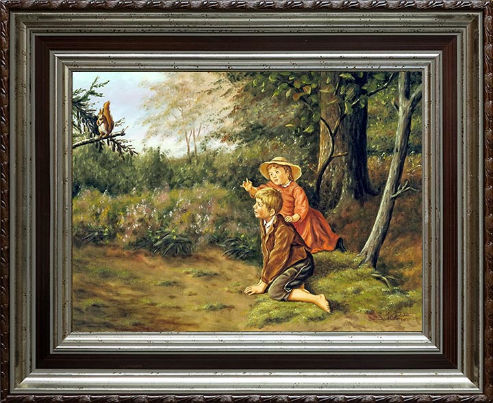 Gemalte Tierbilder mit Menschen: "Schau, ein Eichhörnchen" Ölgemälde 30x40 cm