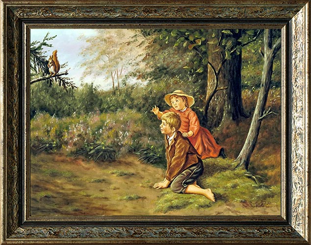 Gemalte Tierbilder mit Menschen: "Schau, ein Eichhörnchen" Ölgemälde 30x40 cm