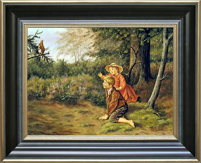 Gemalte Tierbilder mit Menschen: "Schau, ein Eichhörnchen" Ölgemälde 30x40 cm