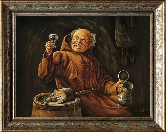 "Der Kellermeister" - Mönch während der Brotzeit/Vesper bei einer Weinprobe im Weinkeller.
