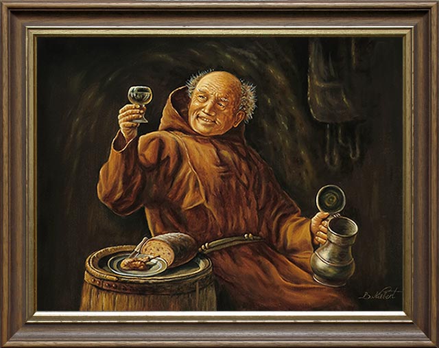 "Der Kellermeister" - Mönch während der Brotzeit/Vesper bei einer Weinprobe im Weinkeller.